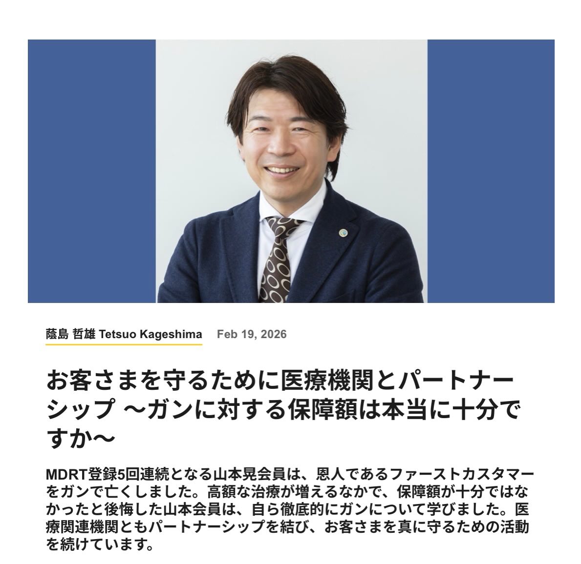 MDRT会員(世界トップクラスの生命保険・金融プロフェッショナルのことで、全保険営業のわずか約2%しか到達できない。)である副社長がMDRTの広報からインタビューを受け、会員サイトに掲載されました。